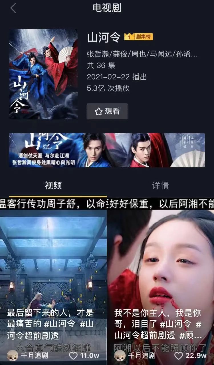 目前抖音电视剧榜单上,热门剧集《山河令》相关短视频播放量达到了5.3亿,如顾湘、曹蔚宁大婚,温客行一夜白头等关键剧情被剪辑成短视频配上bgm快速传播,《你是我的城池营垒》《十二谭》《长歌行》等剧集也是相同的情况,关键剧情或者高光台词被剪辑提纯,快速吸引观众注意并传达信息点。
