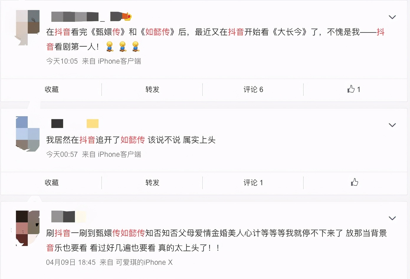 而在这种情况下,长视频平台高成本、高投入的长视频内容就显得转化力低下,成为了“他人的嫁衣”,短视频平台截获了长视频内容的用户流量与传播热度,并完成了内化。这种转化还不止针对在播热门剧集,还包括已经完结的经典剧集。“我是在抖音上看完《甄嬛传》《如懿传》的。”