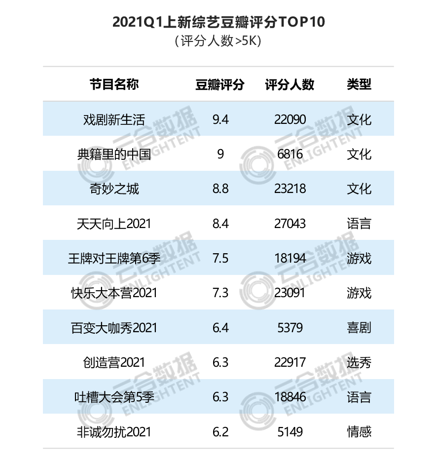 和高热的收视相比,是口碑主导下的市场“唱衰”。在媒体统计的评分人数超过五千的Q1上新综艺豆瓣评分TOP10中,前三甲被新综艺占领,虽然后七席皆是综N代,但除了《王牌对王牌6》豆瓣7.5分的成绩颇为突出,同样杀入TOP10的《吐槽大会5》《创造营2021》豆瓣评分皆是刚过及格线。