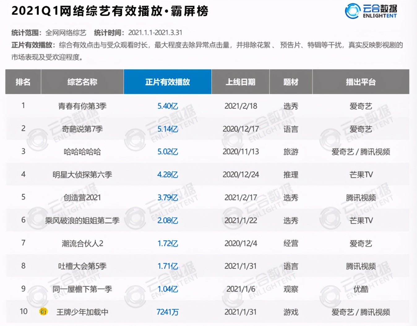 爆款缺失、多个头部项目表现不及预期,是更直观的感受。《王牌对王牌6》以11.98亿有效播放拿下全网断层第一,基本盘稳固但距离出圈仍有距离;选秀对垒中《青春有你3》以5.4亿有效播放登顶网综榜,看似与去年5.1亿持平,但实则是6期节目的差距,颇具爆款品相的《创造营2021》《乘风破浪的姐姐2》有效播放分别是3.79亿、2.08亿;每周都被感慨“杀疯了”的《吐槽大会5》仅有1.71亿。