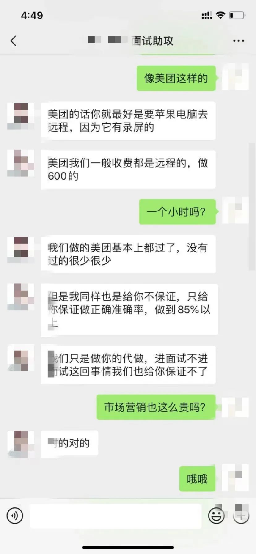 代考顾问多次向字母榜表示,“我们做的美团基本上都过了,没有过的很少很少。保证做正确,准确率做到85%以上。美团的收费标准都是远程的价格,600元。”
