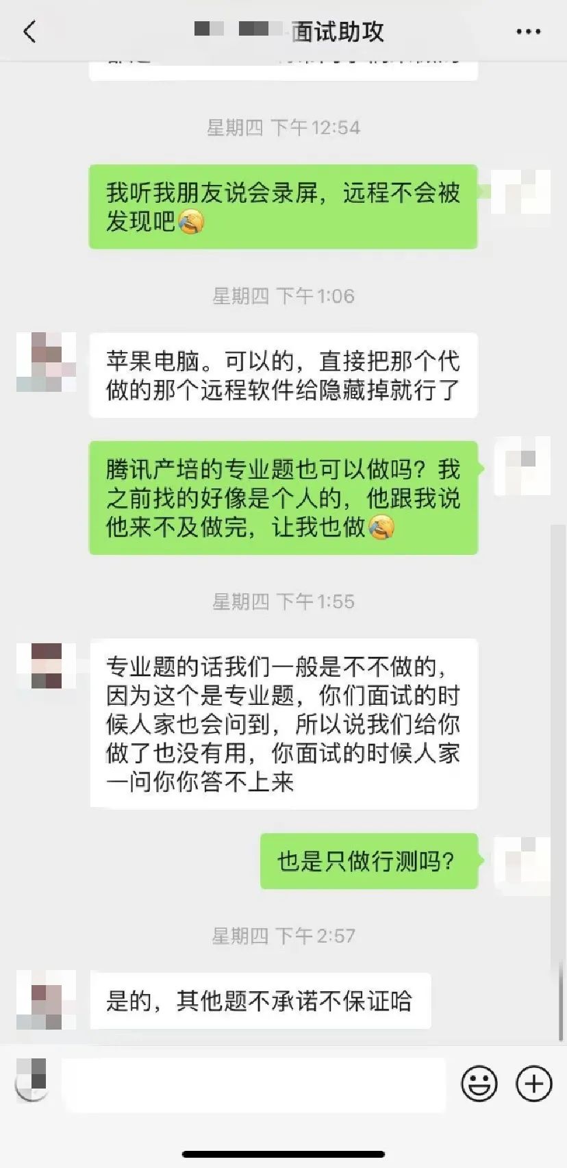 楚楚介绍称,一般大厂笔试题都是行测题+专业笔试题两部分,专业笔试题她会自己在网上复习,而行测部分则会找代考来帮忙完成。“行测题毕竟以后对我也没有用,花时间去学习以后用不到的题,得不偿失。”楚楚坦言,“有代考能通过考试,还能腾出时间让我复习专业课,肯定比我自己学要靠谱。”