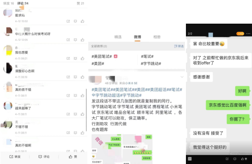 微博是代考机构常用的揽客途径之一,代考机构在发布微博内容时加上大厂笔试的相关话题,来寻找客源或者方便客源寻找。在一些博主推送笔试代考的微博之下,不少网友都在底下评论“太棒了”、“不错不错”之类的言论,对这种方式表示赞同。甚至还有博主晒出私信显示,不少人通过这种方式拿到了大厂面试的机会。