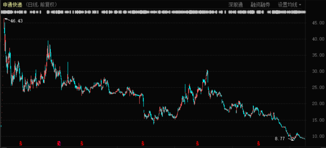 申通快递2020年前三个季度营业收入下滑5.73%,扣非净利润负增长131.04%,三季度净利润环比暴跌了631.59%,在此之前的2019全年,其扣非净利润已经下滑两成,其股价自2019年7月底以来已经暴跌70%;