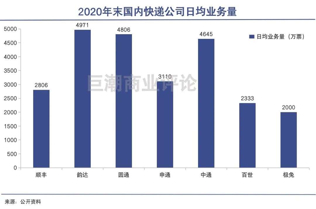 2020年末国内快递公司日均业务量