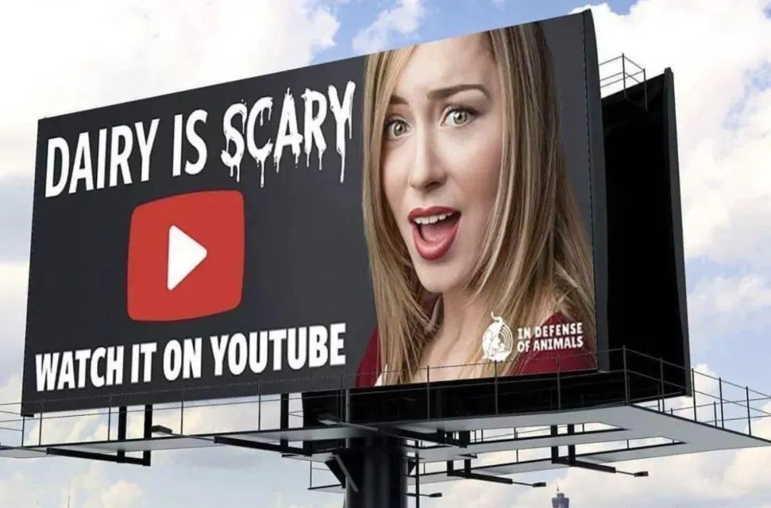 2018年6月18日,美国加利福尼亚州的非营利性动物保护协会IDA决定发起一场大规模的环保运动。一时之间,从长滩到洛杉矶市中心的30多公里路程中架起了60多个巨幅广告牌,上面写着“Dairy Is Scary”(乳制品很可怕)。