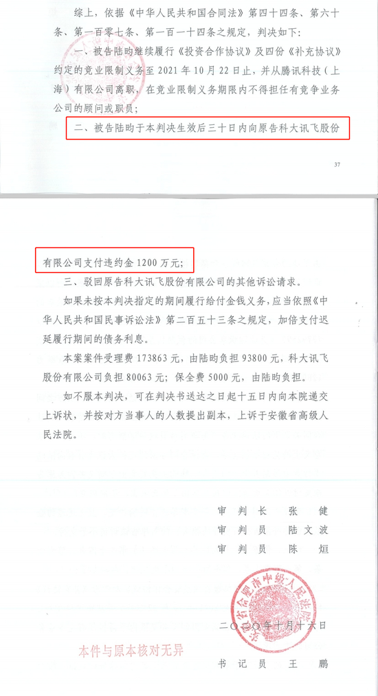 2020年10月16日,合肥市中级法院作出一审判决:判令陆昀赔偿科大讯飞1200万元违约金,并从腾讯(上海)公司离职,在竞业限制义务期限内,不得担任有竞争业务公司的顾问或职员。