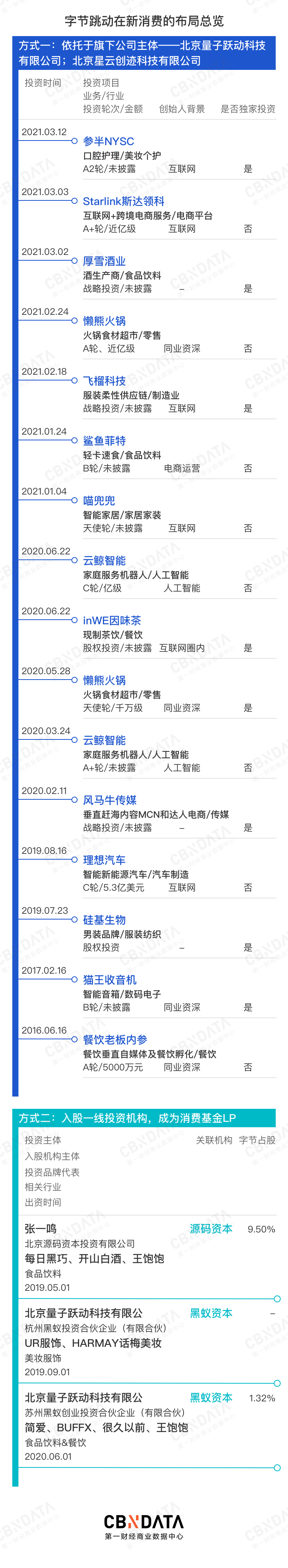 字节跳动从2016年试水消费赛道,到2019年正式入局消费,再到2020年之后高频率出手,字节跳动的“消费观”逐渐形成和成熟。作为“字节跳动系”的消费投资主体,北京量子跃动科技有限公司也随之频繁出现在消费投融资的视野。