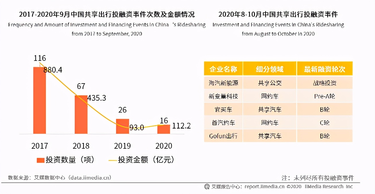 其实放眼于在整个共享出行行业上,整个资本市场正逐步回归理性。据艾媒咨询数据,近年来行业内的融资事件与总金额呈现下降趋势,其中在2020年,中国共享出行共发生16起融资事件,总金额为112.2亿元。