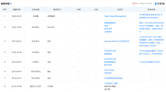 回顾字节的历史融资,也是有迹可循。截止目前,字节跳动至少经历了9轮融资,且每次融资所带来的估值都水涨船高。仅在2020年,字节就至少完成3轮融资,这也让字节估值从最初的750亿美元一路高涨至2020年12月的1800亿美元。在这些融资方中,也不乏大牌投行的存在,包括顺为、红杉、软银、老虎等,知名投行的看好,或许在一定程度上助推了字节上市。