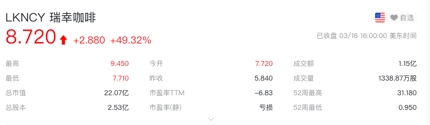 当日,瑞幸在美股粉单市场涨超49%,市值一夜大涨超7亿美元(约合人民币45亿元)。