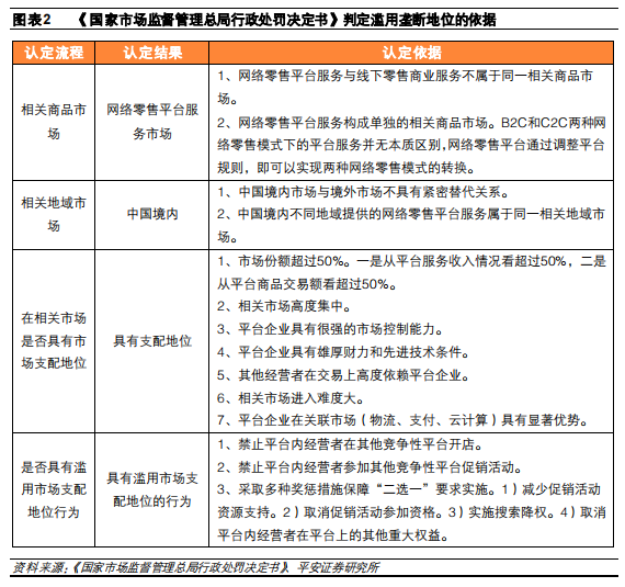 其实垄断并非仅仅和市占率有关,《国家市场监督管理总局行政处罚决定书》显示,判定滥用垄断地位的依据有很多。比如在认定是否具有市场支配地位上,除了市场份额是否超过50%外,还要看平台企业是否有很强的市场控制能力、有没有雄厚的财力、在关联市场有没有显著优势等。