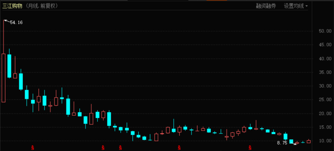 三江购物(SH:601116)则更为典型,阿里收购其股权曾带动其股价一飞冲天,但随时就开始了长达数年的漫长阴跌。