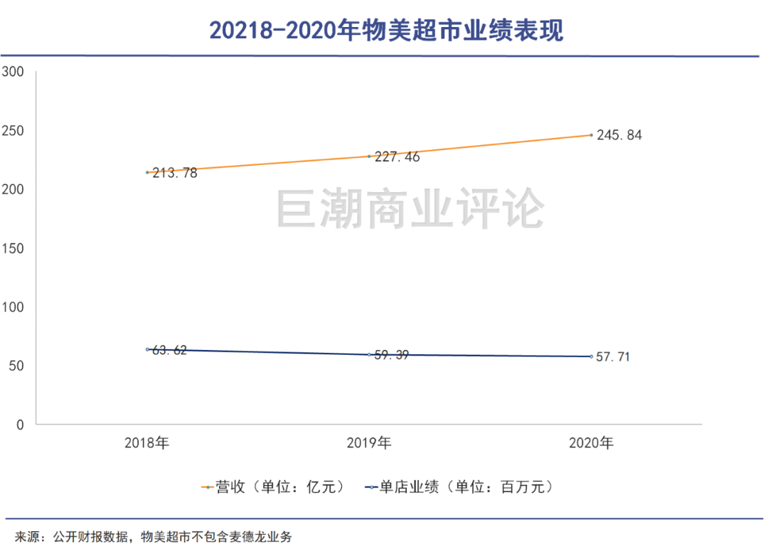 如果再具体到单店业绩,甚至还是下滑的。数据显示,2018年-2020年底,物美科技旗下的物美超市门店数量分别为336家、383家、426家。对应物美板块近三年营收可以计算出,其单店业绩和经营效率在不断降低。