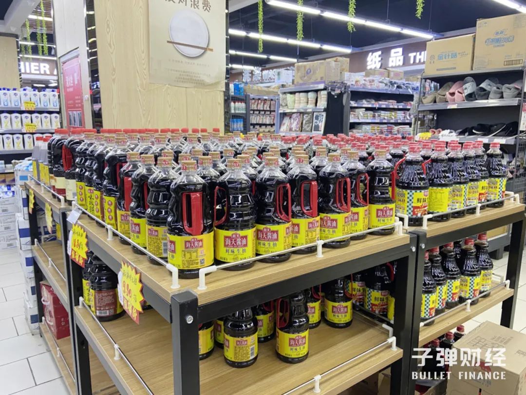 「子弹财经」在北京市朝阳区多家超市内看到,在酱油产品陈列区,海天酱油、蚝油等产品种类繁多,占据的货架陈列位远甚于其他品牌产品。