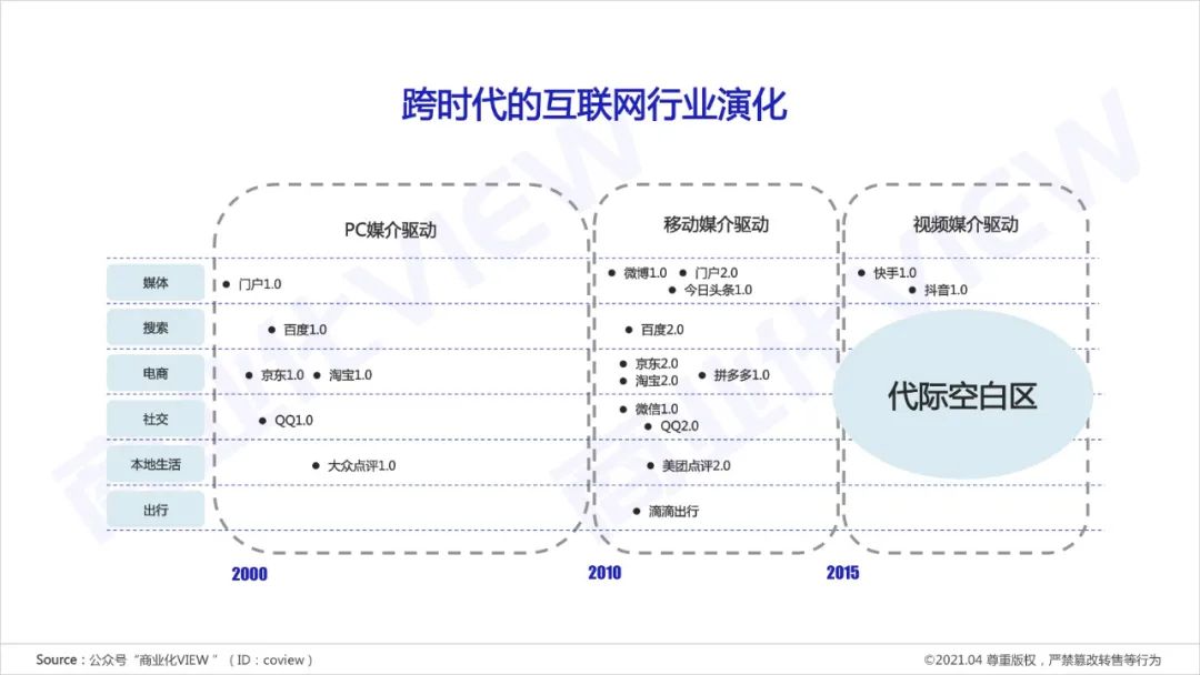抖音就是这个时代的代表性产品,他目前的属性是一个超级视频媒体。但如果放大到整个互联网行业,在很多领域的代际升级还远未完成,典型特征就是上面提到的“代际空白”。