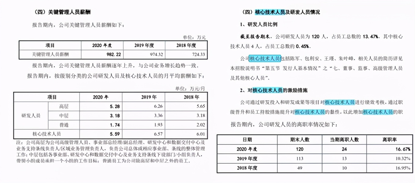 通过零点有数的薪酬体系来看,各报告期内公司管理人员薪酬逐年攀升研发人员尤其是核心研发人员平均薪酬却逐年降低,与之对应的公司研发人员离职率从2019年的10.32%增至16.67%。