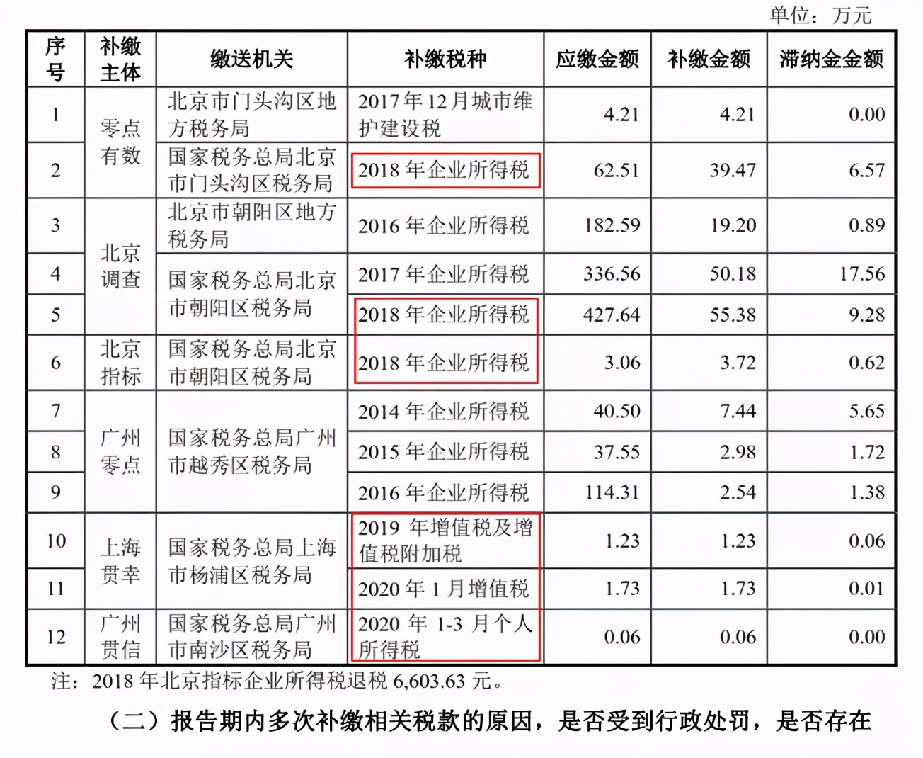 作为法律人出身的袁岳,2015-2020Q1期间多次补税并缴纳由此导致的滞纳金,累计共有12项。其中2018-2020年报告期内,零点有数共计有6项补税记录,涉及企业所得税、增值税及增值税附加税、个人所得税多个税种,由下图可知,零点有数2018年企业所得税补缴金额较应缴金额尚有差距。