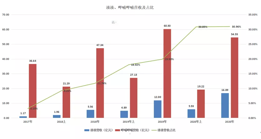 过去四年,湊湊在集团中的营收占比不断攀升。在2017年,湊湊仅是占比3.19%的新兴品牌,但到了2020年,湊湊在集团中的占比已经提升至30.96%。