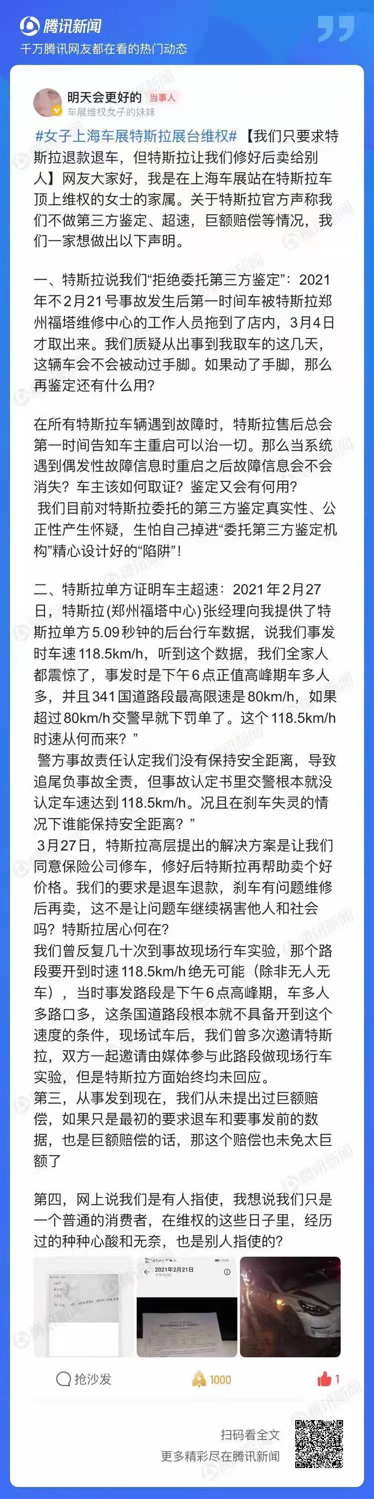 维权女子家属发声:要求特斯拉退款退车,但特斯拉让我们修好后卖给别人