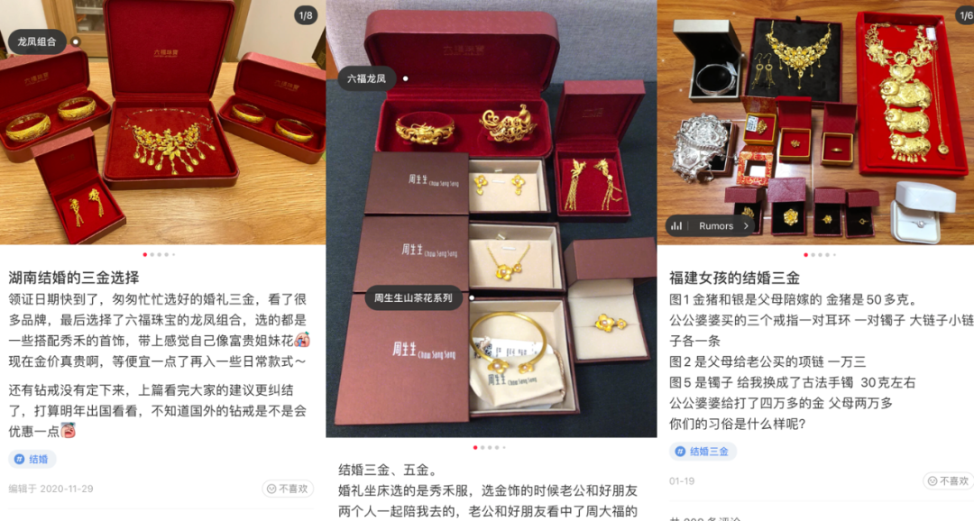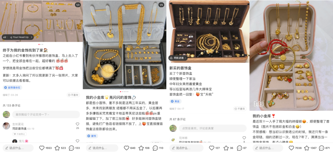 而社交媒体上,也不断有人晒出自己的金饰存货,从小金牌、小金坠到沉甸甸的金镯子、金链子,黄金饰品在年轻一代的首饰柜中,似乎越加拥有一席之地。
