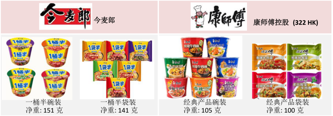 2018年,今麦郎传出上市消息,直指统一和康师傅的地盘。从图中我们不难看出,今麦郎和康师傅各自的经典产品品类几乎平行,甚至包装配色也是一个色系。产品无差异化,今麦郎便在与康师傅价格相当的情况下加大了净重,直指中低端市场。