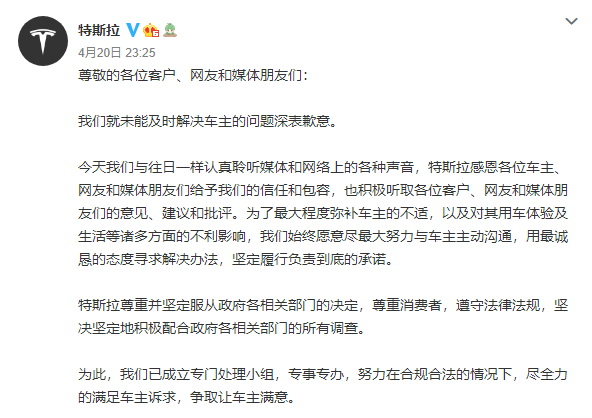 4月20日深夜,特斯拉发布一纸声明,一改强硬姿态,向上海车展维权事件的女车主致歉。