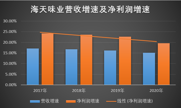 2017年~2020年,海天味业营收增速分别为17.06%、16.8%、16.22%,15.13,营收增速逐步放缓。同时,四年里年净利润增速分别为24.21%、23.6%、22.64%,19.61,净利润增速总体较快,但增长趋势放缓。