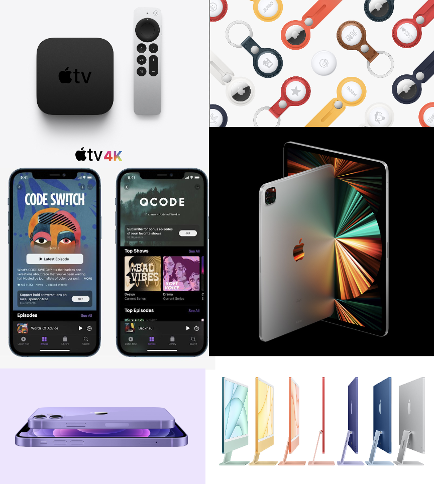 4月21日凌晨1点,2021苹果春季新品发布会如约而至。此次发布会总时长为1小时,苹果却不讲武德地发布了7款产品和1项订阅服务,分别为新款iPad Pro 11英寸/12.9英寸、iPhone 12/12 mini的紫色款、AirTag、新款Apple TV 4K、7款配色的新款iMac 24英寸、全新的播客订阅服务Podcasts。