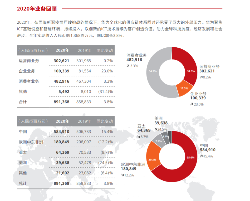 根据华为2020年年报显示,2020年华为增长大幅放缓,全年营收8914亿元,同比仅增长3.8%。而在此前三年,华为均能实现约19%的同比增长。