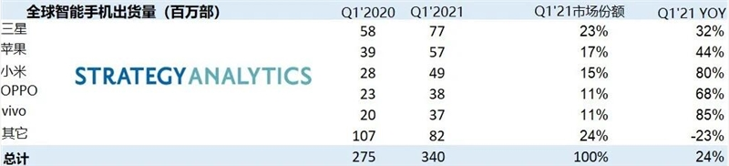 根据Strategy Analytics发布的今年Q1全球智能手机出货量报告,全球前五已经没有华为的身影,后者成为了“其他”。