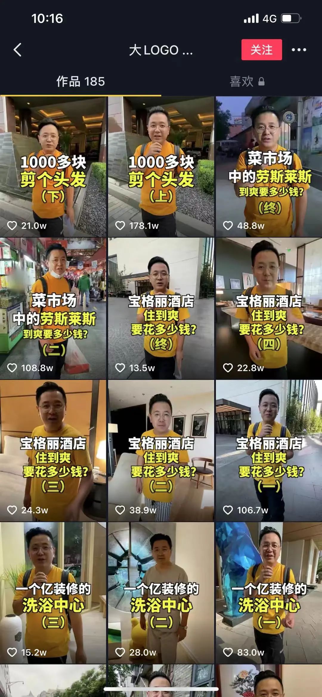 不久后,他发现了“炫富”是最佳的流量抓手。从去年6月开始,“大LOGO”发布了一则“300元一两的牛排”吃播体验,单条点赞量蹿升到了42万次。此后,他便开始专心做高端餐饮、酒店的探店视频,迅速走红。一个月后,“大LOGO”的粉丝数量已增长到了200万;到10月,粉丝数突破千万。