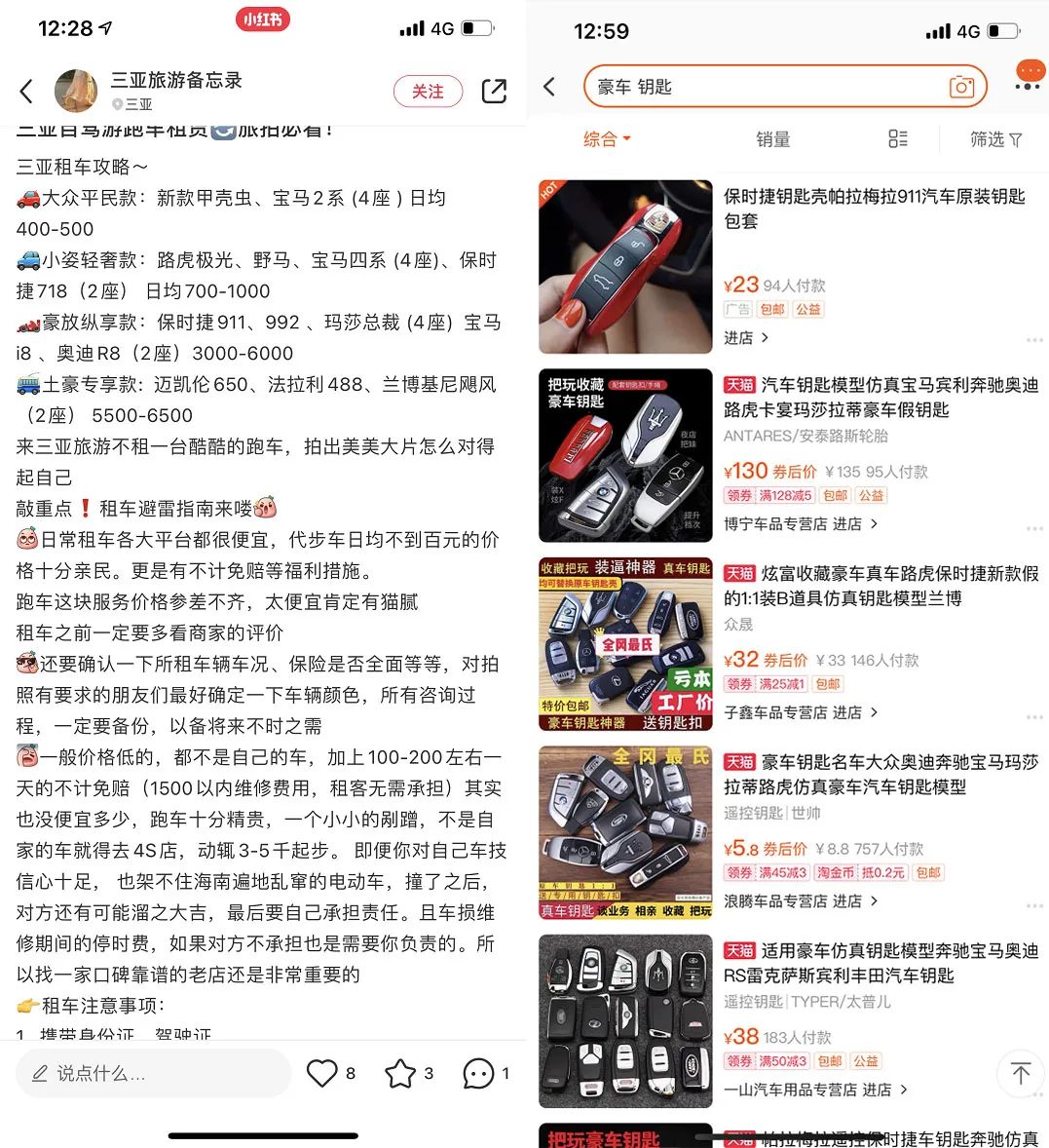 除了如上的虚拟商品,实体“炫富”产品的购买和租赁也十分便利。在电商平台上可轻松花费数十元,买到各种豪车的车钥匙。花费数十元一天可以租到各品牌的名包。数百元到数千元,可以租到名车拍照。可以说,整条“炫富”产业链已经十分完备。