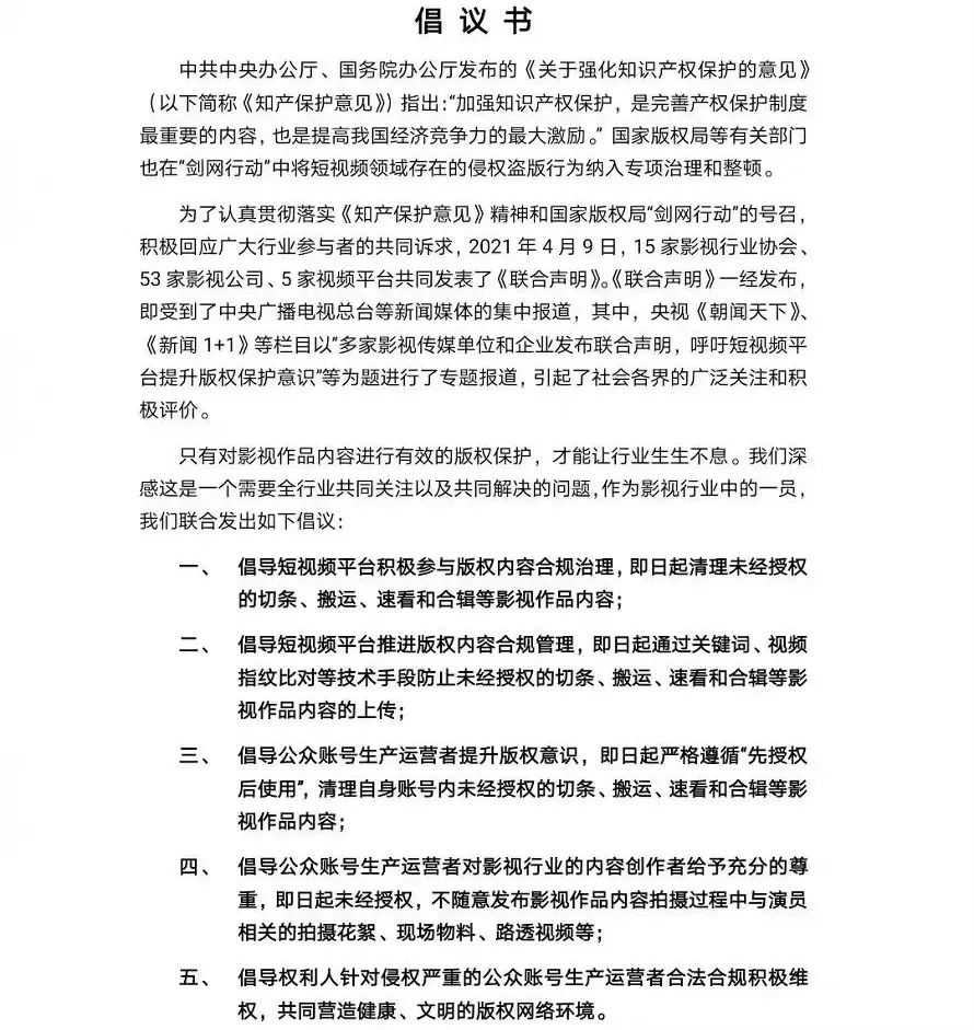 4月23日,各大影视公司和视频平台联合500余位业内人士发出联合倡议书,再度呼吁短视频平台推进版权内容合规管理,清理未经授权的影视作品内容。此外,倡议书表明“先授权后使用”的立场外,也向公众账号生产运营者强调,未经授权不能随意发布影视内容拍摄过程中与演员相关的拍摄花絮、现场物料、路透视频等。