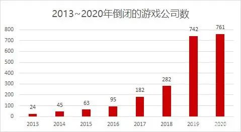 根据游戏媒体游戏新知统计,从2013年至今,一共2194家游戏公司宣告死亡,且增速逐年上升,从游戏新知发布的图表能看出,2019年国内倒闭游戏公司数量为742家,2020年为761家。也就是说,过去两年时间里倒闭的游戏公司占到了七年来倒闭游戏公司的近七成。
