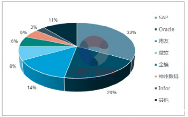 根据《2018-2024年中国ERP软件市场现状分析及投资前景预测报告》,2018年国内ERP市场份额占比中,用友以31%的份额占据第一,SAP以14%的份额位居第二,在高端ERP市场中,SAP占据了33%的市场份额,占据绝对第一。