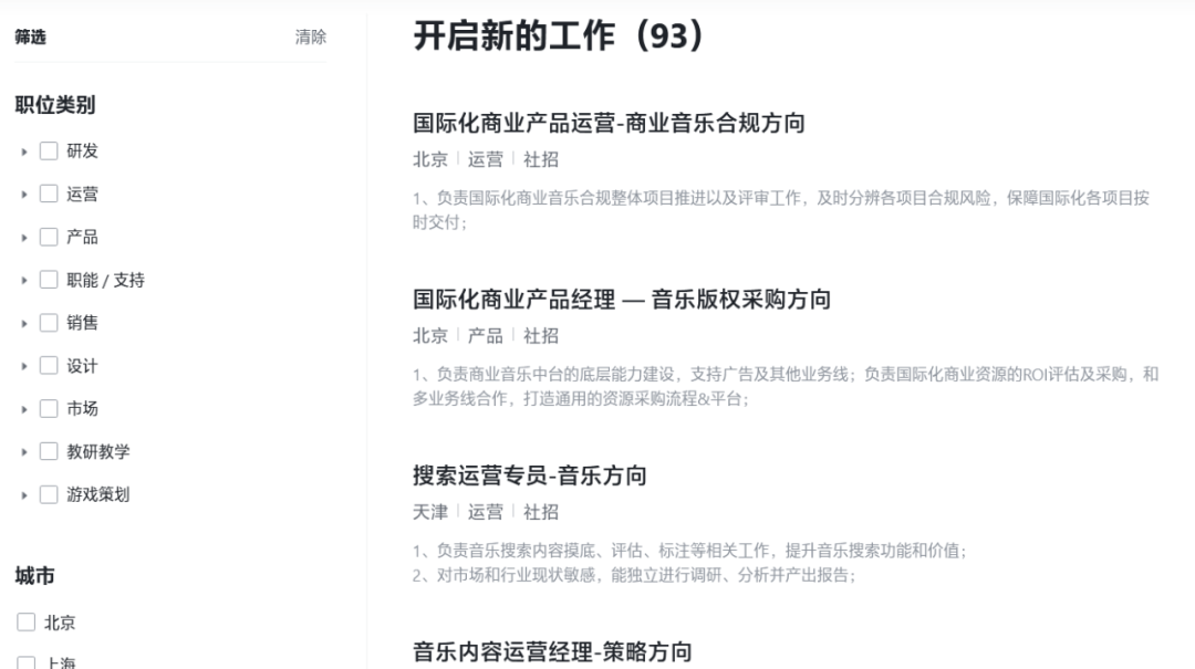 根据字节跳动官网的招聘信息,音乐相关的岗位已有93个,包括搜索运营专员、音乐内容运营经理、音乐用户产品经理等多个职位,涵盖版权维护、运营、研发等多个类别。