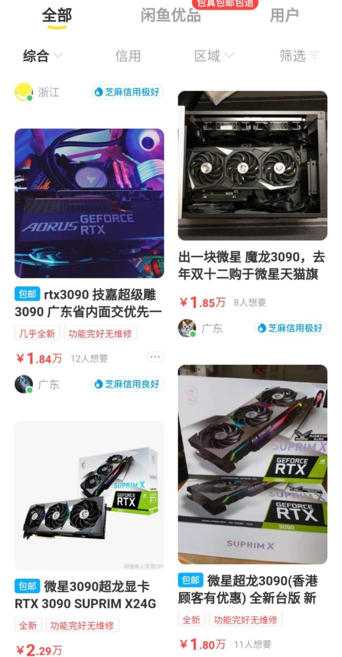 在闲鱼上,用于挖矿的几款显卡,交易价格都被叫到了1万元、2万元左右,很多显卡还没有货,火爆程度堪比茅台。