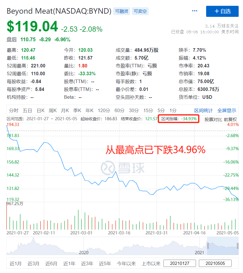 然而,行业热闹纷呈的背后,人造肉明星股Beyond Meat却未能令资本持续兴奋,业绩亏损持续放大,股价至最高点已下跌34.96%。北京时间5月7日,Beyond Meat对外发布新一季度财报。