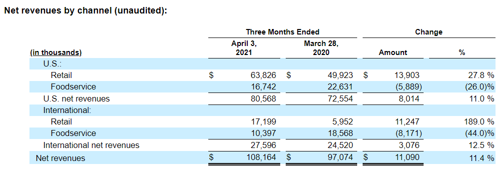 作为一家来自美国加州的食品厂商,Beyond Meat的业务主要起源于美国,其中营收74.48%来源于美国,25.5%来自美国国外,而若按渠道来源来看,营收的74.9%来自C端零售,另外的25.09%来自于B端餐饮服务的供应链业务,综合地区与渠道来源来看,美国地区的零售业务贡献了绝大部分的营收,国际业务的收入规模占比相对较小。、