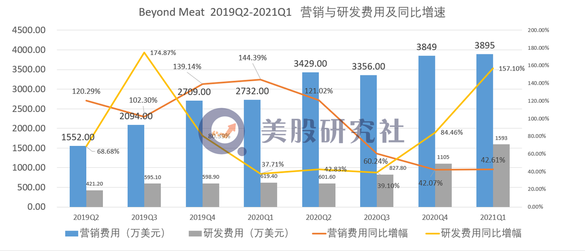 费用结构方面,Beyond Meat营销费用占营收的占比连续4季度攀升至30%以上的高位,本季度研发费用占营收的比例连续3个季度增长至8%左右的高位,仅营销与研发费用2项就已经占到公司总营收的51.72%,如此之高的成本费用,也难怪Beyond Meat连续4个季度亏损了。