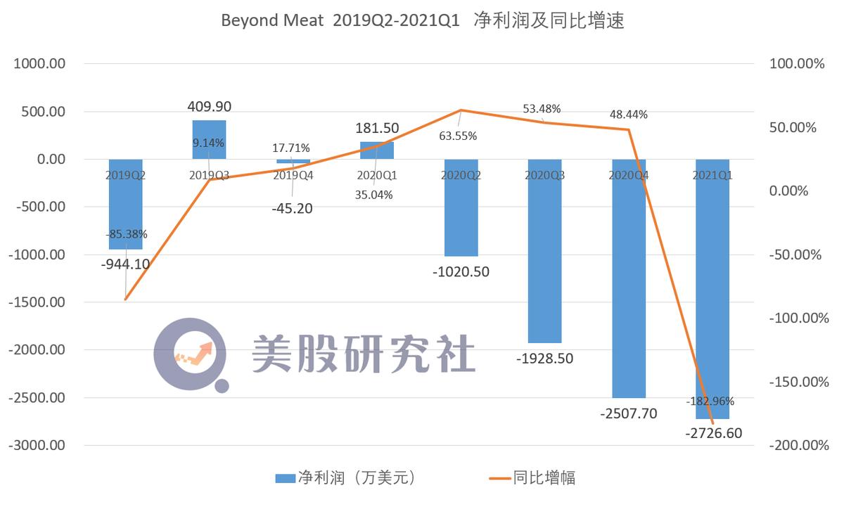 本季度Beyond Meat净利润亏损2726万美元,同比下降-183%,净利润连续4个季度亏损,且净亏损金额更是创出历史新高,增长乏力净亏损放大的Beyond Meat并没有扭转前3个季度以来的颓势。