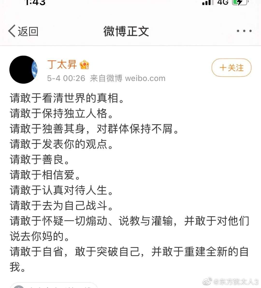 在互联网世界中,丁太升输出的观点不限于音乐,大部分是朴实的普世价值观。他总是不厌其烦地劝告网友要独立思考、多读书、不惧权威、勇敢去追求自由与爱,细究“独立思考”的内核,不过就是带着更多的理性、涉入更多的知识和理论角度去看待问题。