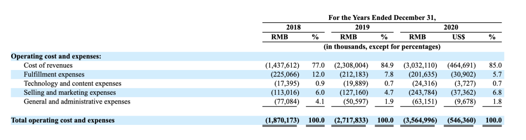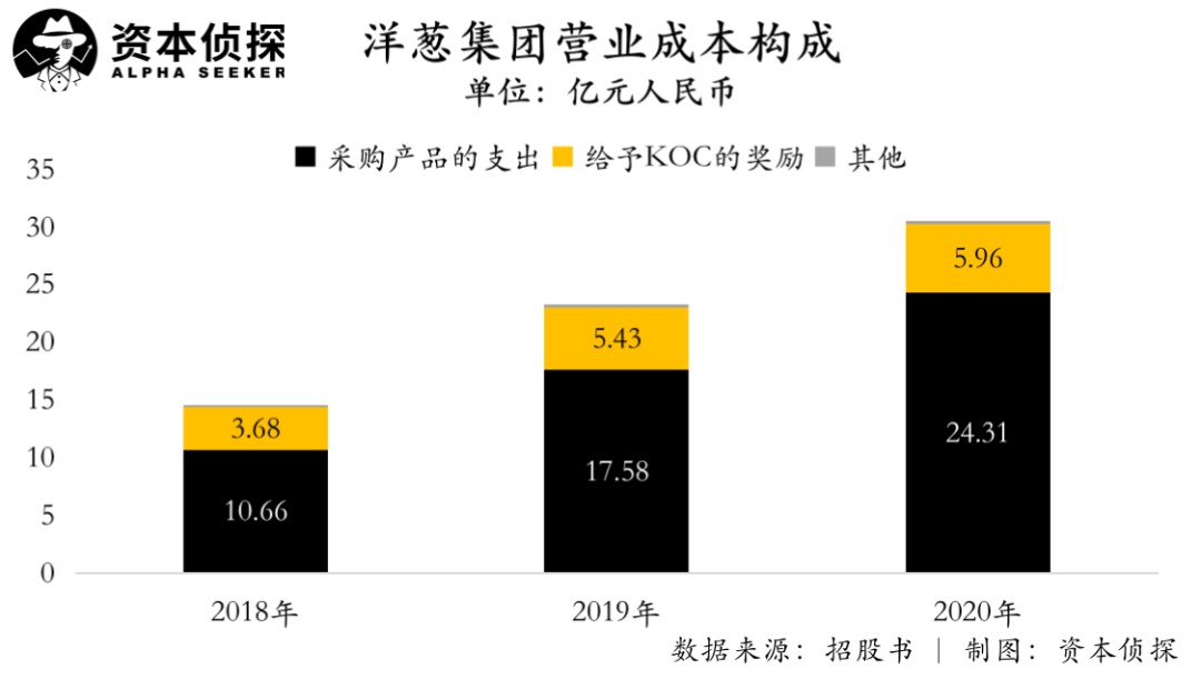 根据招股书,洋葱集团2018年到2020年的营业成本分别为14.38亿元、23.08亿元、30.32亿元,占总营收比例分别为77%、84.9%和85%。具体而言,洋葱集团的营业成本主要由采购产品的费用和给予KOC的奖励组成,前者是平台经营的主要成本,后者则指的是平台根据交易给予KOC的佣金。