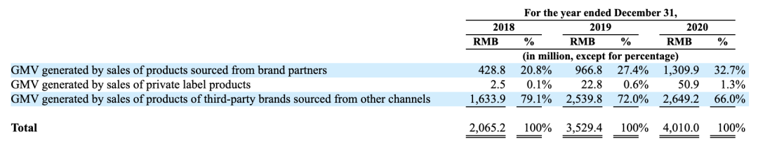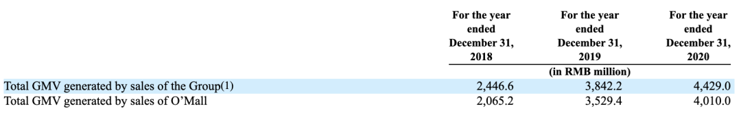 从比例上看,销售“来自其他渠道第三方品牌的产品”所产生的GMV是O’Mall商城GMV的主要组成部分,该部分GMV在2018年到2020年分别占O’Mall商城GMV的79.1%、72%和66%;同期,销售来自品牌合作伙伴的产品所产生的GMV占O’Mall商城GMV的比例为20.8%、27.4%、32.7%。自有品牌产品所产生的GMV占比则一直较低。