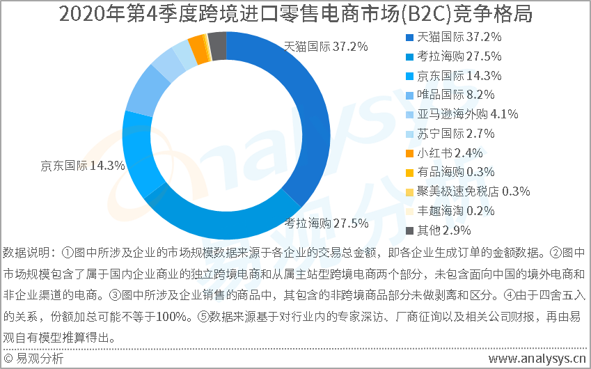 但时过境迁,经历几年的发展,跨境电商已经成为只属于巨头的游戏。根据易观分析发布的《中国跨境进口零售电商市场季度监测报告》,2020第四季度,天猫国际规模排名第一,份额为37.2%;考拉海购排名第二,份额为27.5%;京东国际排名第三,份额为14.3%。