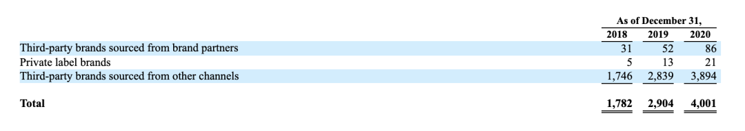 据招股书介绍,截至2020年12月31日,洋葱集团旗下平台上共提供逾4000个品牌的产品,其中包含86个来自合作伙伴的第三方品牌、21个自有品牌,以及从全球数百个授权经销商和转售商处购买的品牌(即“来自其他渠道的第三方品牌”),产品包括了美容个护、母婴、保健、食品饮料、时尚产品等品类。