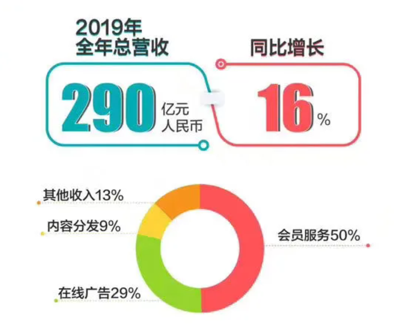2019年同样如此。全年总营收达到290亿元,同比增长16%,同期会员服务业务的营收为144亿元,同比增长36% 。全年内容成本为222亿元,仅增长了6%,但全年亏损额却超百亿元。