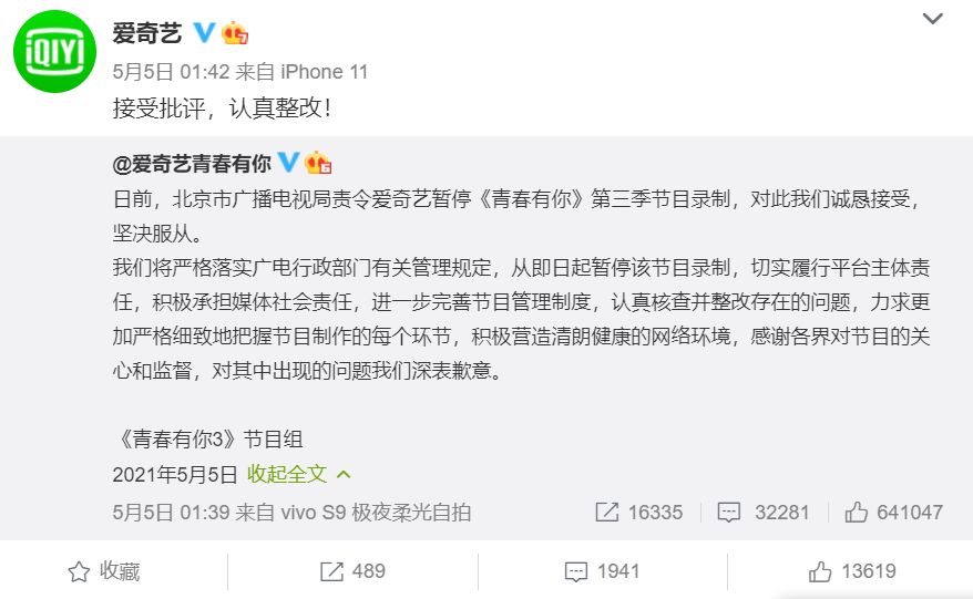 被责令停播后,青你3的官方微博在5月5日回应称“诚恳接受,坚决服从”。