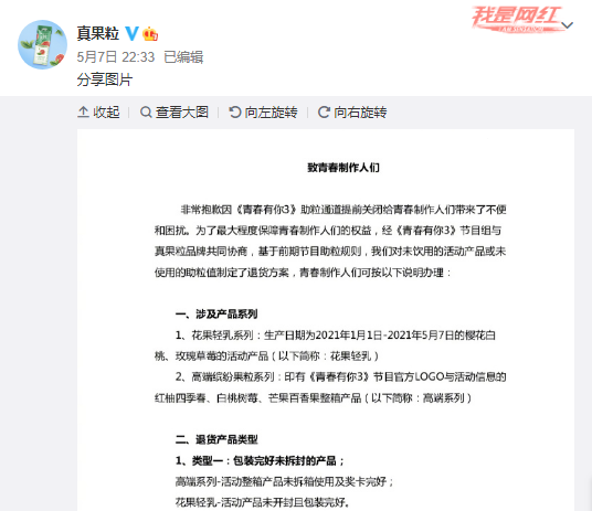 5月6日晚,在被舆论连番轰炸了两天后,爱奇艺在微博发表致歉声明,称对于此前“倒牛奶”视频所造成的影响,感到内疚与自责。9个小时后,蒙牛真果粒也发布致歉声明。